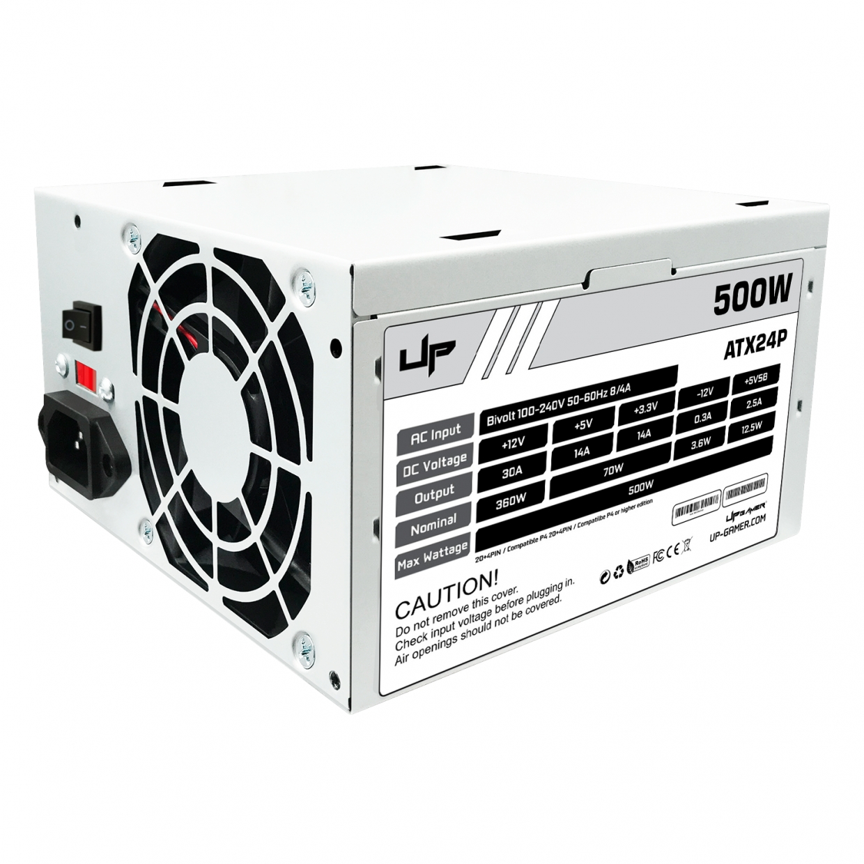 Fonte UP Gamer 500W, ATX24P, c/ Cabo, Bivolt Chaveada, Prata, 24-Pin, 50-60Hz 6/4A