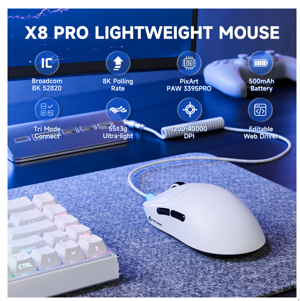 Mouse Gamer Sem Fio ATTACK SHARK X8 PRO PAW3395PRO Trimodo USB-C BT 2.4Ghz White