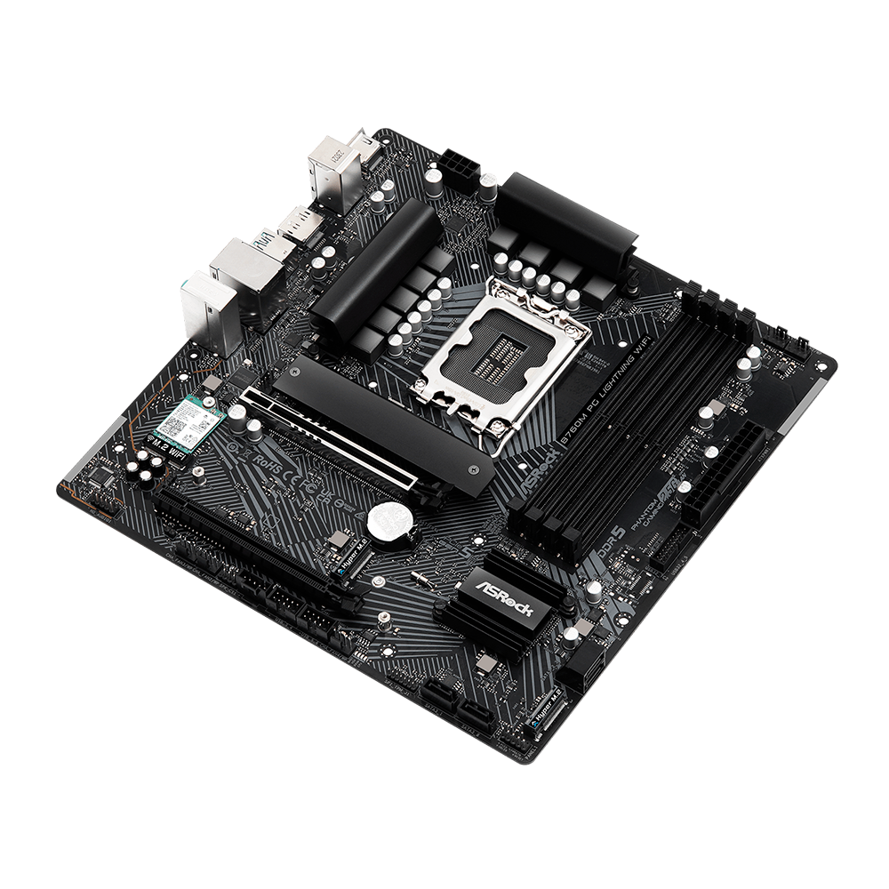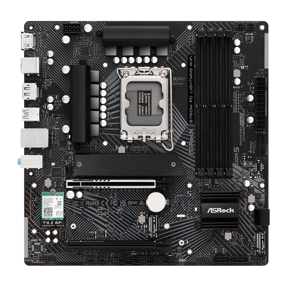 Placa Mãe 1200 Asrock B760M PG Lightning Wifi 4xDDR5, 3xHyper M.2 NVMe, 1xHDMI, 1xDisplayPort 1.4, , 1xUSBC 3.2, 2xUSB-A 2.0, 2xUSB-A 3.2, 1xRJ45 Gigabit 2.5, 1xAudio, M-ATX