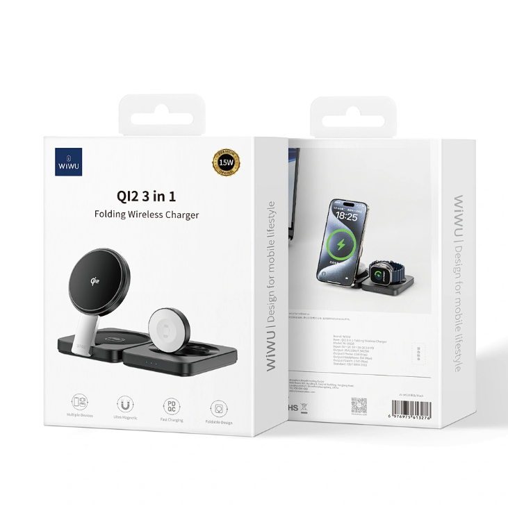Carregador WiWU WI-W028 QI2, 3 em 1, Dobrável, 15W 3A, s/Fio - Preto